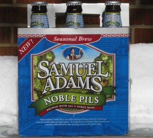 I was excited to find Samuel Adams Noble Pils, the newest offering from the Boston Beer Company (Boston, MA). According to the press release published on BeerNews.org, “since 2005 the brewers at Samuel Adams have been offering drinkers a voice in choosing one of the new beers they will introduce in the coming year. Last year, voters in the 5th annual Samuel Adams Beer Lover’s Choice contest were decisive in choosing Samuel Adams Noble Pils, a hoppy pilsner beer brewed with a recipe that calls for all five varieties of Noble Hops (of the 100+ hop varieties in the world only five are judged ‘Noble Hops’ and this beer uses all five). The voters’ response to the new Noble Pils was so enthusiastic that the brewers decided to make it the new spring seasonal brew, replacing Samuel Adams White Ale. It joins Summer Ale, OctoberFest and Winter Lager in the brewery’s year round seasonal line-up.”