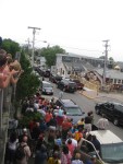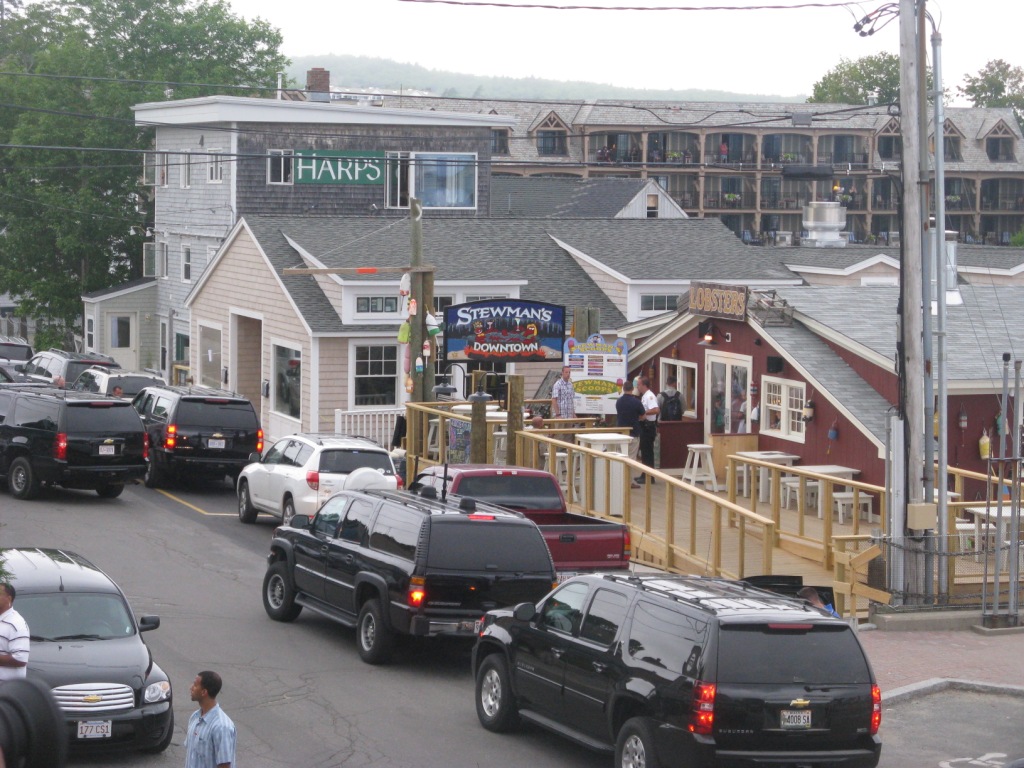 We decided to grab a table for dinner at the Quaterdeck, across the street from Stewman’s. We sat outside on the second story deck overlooking the harbor.  From the deck railing, we had a perfect view of the lively scene on the street below. A large crowd had gathered on the sidewalk eager for a glimpse of the President. Five black SUVs were parked on the street, along with police cars and a bus for the President’s press corp. From my vantage point, I could just make out the profile of the President through the window of Stewman’s.