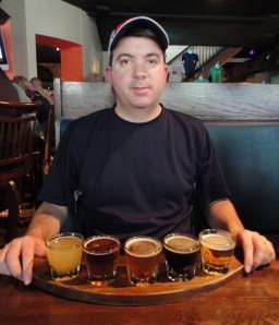 We walked into the Moon River Brewing Company on Bay Street and were seated right away. After a long drive, I wasted no time ordering a plate of nachos and a sampler rack, which featured five house beers (pictured from left to right):