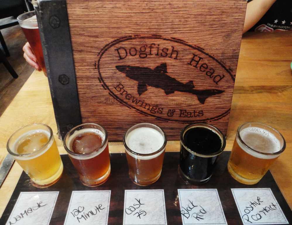 The brewpub is a few blocks off the boardwalk in downtown Rehoboth Beach, and we had no trouble finding a parking spot. We arrived just as they were opening and it didn’t take long for both floors of the brewpub to fill. I ordered a sampler of five Dogfish Head brews: