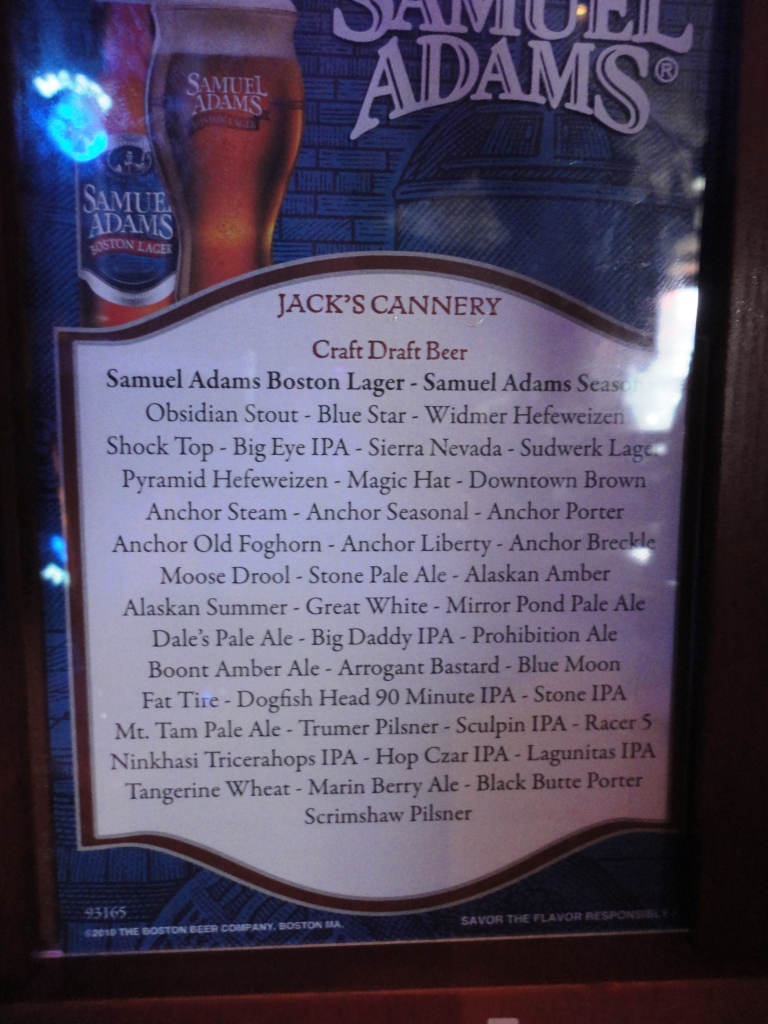 With more of the city to see, we left the Public House for a leisurely walk down to Fisherman’s Wharf. After playing tourist along the Wharf for a while, we settled in at Jack’s Cannery Bar. We actually just stumbled onto the place, drawn in by the promise of 85 beer taps. After jostling with the crowd of tourists around the Wharf, Jack’s was a welcome respite. There were only a few people at the bar, and the bartenders treated us to quick and friendly service. I enjoyed a few pints of beer I can’t find back home: