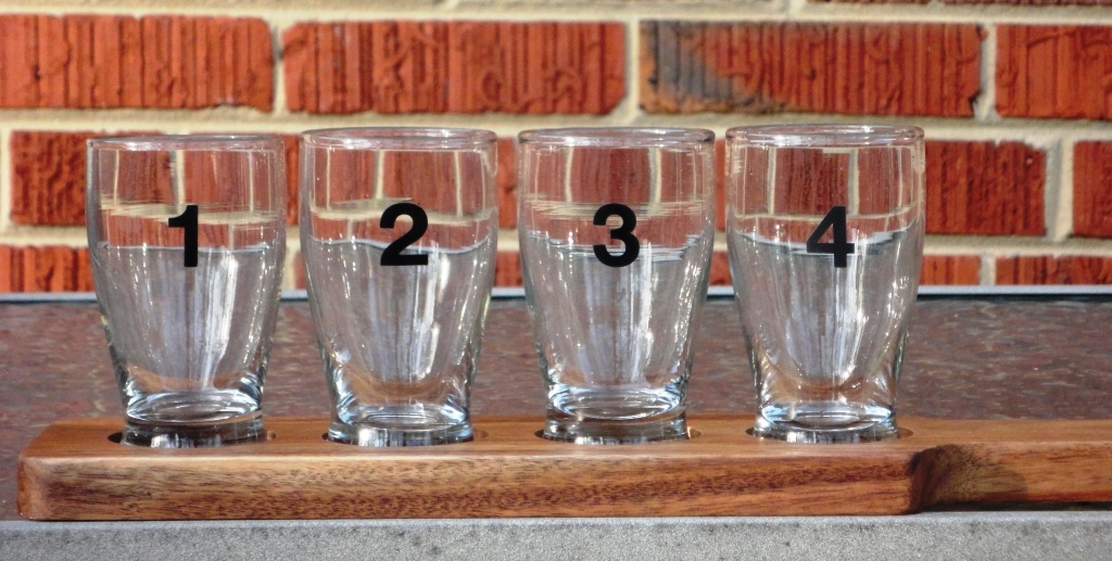 As described by Crate and Barrel: Numbered sampler glasses line up on acacia wood paddle…Classic beer glasses hold 5 oz. for tasting parties, the beer curious and the studious connoisseur. These glasses would look a lot better if they were filled with beer. Thanks Karen and Glenn!