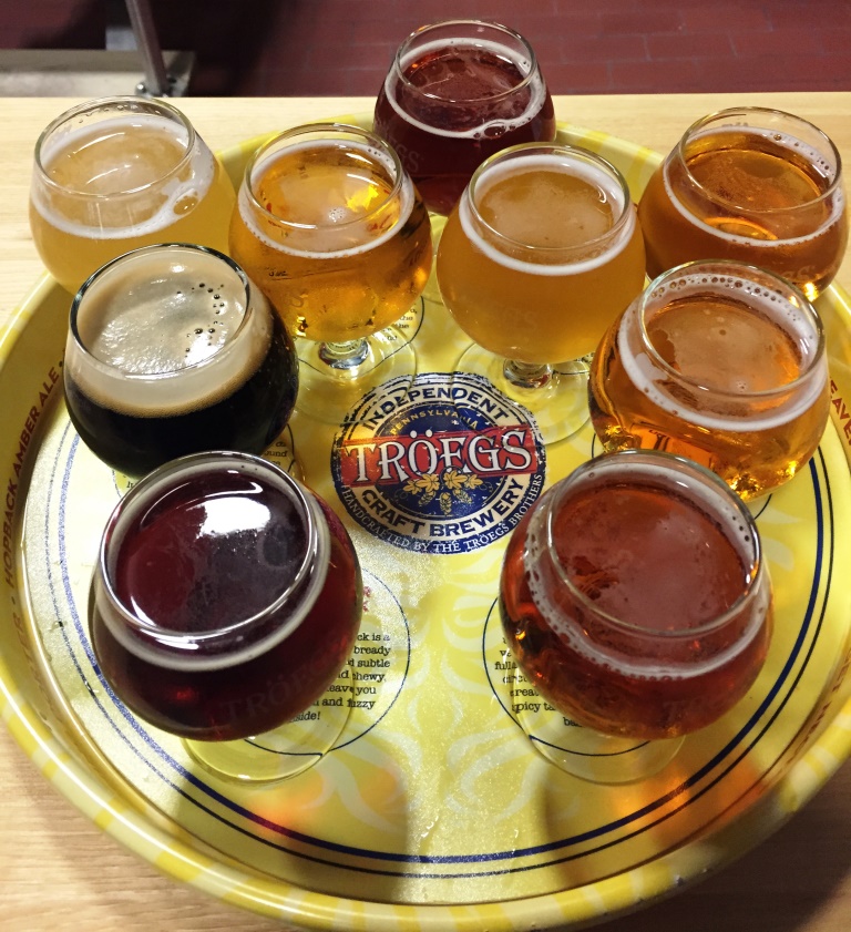 After loading up on chocolate at Hershey’s Chocolate World, I made the short drive to Tröegs, one of my favorite breweries in the Mid-Atlantic region. The wait in the long line at the busy tasting room was well worth it, as I walked away from the bar with a sampler tray of nine beers.